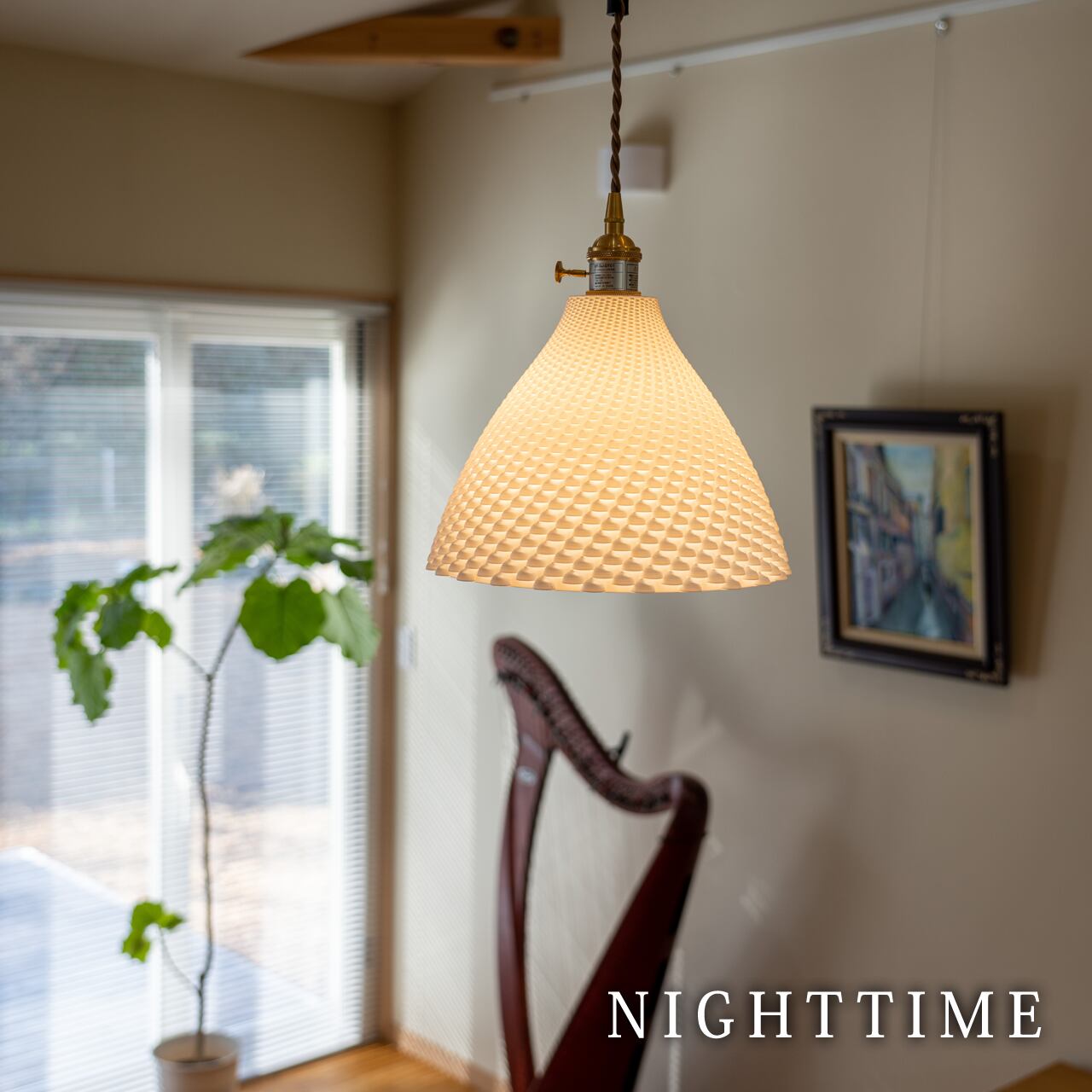 シェードは白色で、光を透過する材質ですので、色や明るさによって自在に変化します。